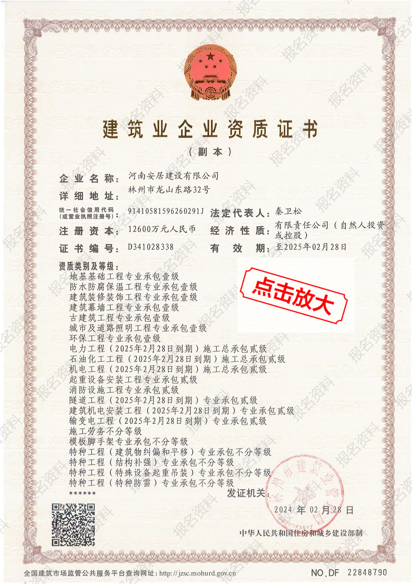 滔滔黃河哺育了中華民族拼搏向上的奮斗精神,巍巍太行造就了中原兒女的紅旗渠精神。百萬林州人下太行,鑄就了中國建筑之鄉(xiāng)響當(dāng)當(dāng)?shù)囊燮放?。河南安居建設(shè)有限公司從誕生起血液里就流淌著紅色基因,秉承“安得廣夏千萬間,大庇天下寒士俱歡顏”的擔(dān)當(dāng)精神,用鋼筋混凝土筑起了高樓大廈,也用一流品質(zhì)、家國情懷打造了安居建設(shè)的輝煌成績。公司成立于2012年,注冊資金12600萬元,公司成立至今,擁有建筑,市政施工總承包等十項(xiàng)一級資質(zhì);其他二級等資質(zhì)共二十余項(xiàng)。公司秉承質(zhì)量第一,服務(wù)為主,堅(jiān)持垂直管理,從不設(shè)立分公司等分支機(jī)構(gòu)。